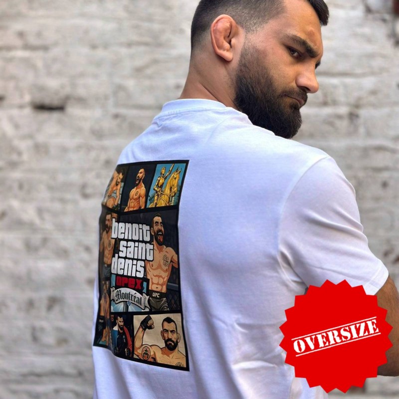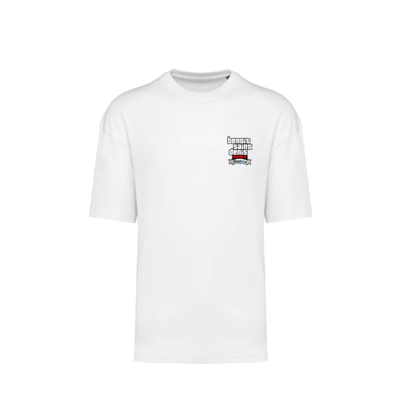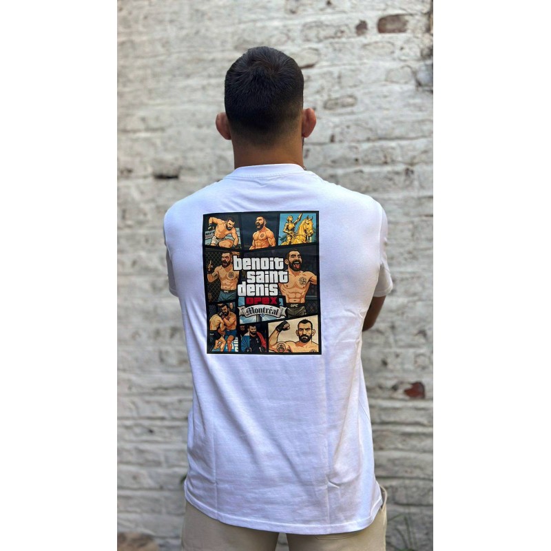 Dans le dos, un design inspiré de l’univers graphique de GTA : illustrations en mosaïque, atmosphère de combat stylisée, hommage visuel à l’engagement et au panache de BSD sur le ring. Une référence forte à la culture vidéoludique et au storytelling visuel des jeux cultes.