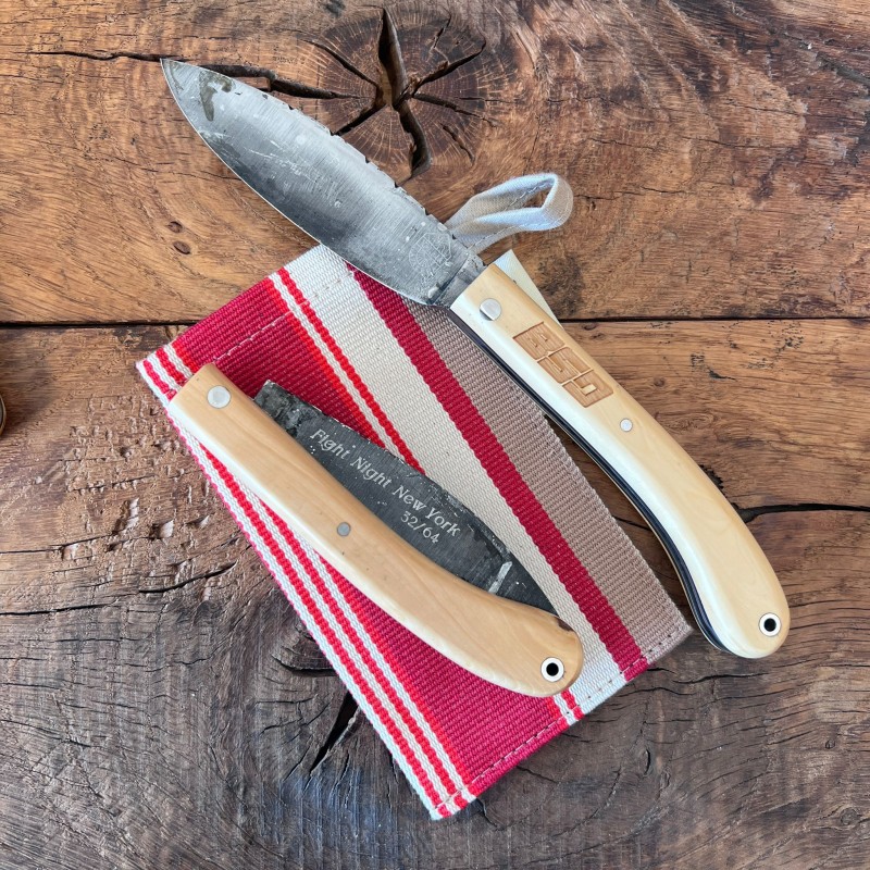 • Lame (9 cm) : Acier carbone — coupe fine, patine naturelle, forme feuille de sauge pour une précision fluide. Gravure Fight Night New York + numéro du couteau.