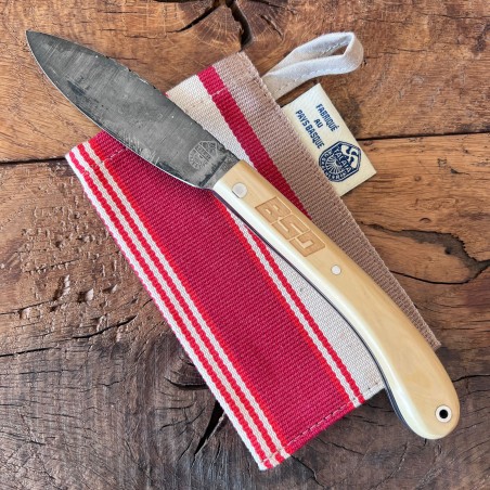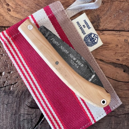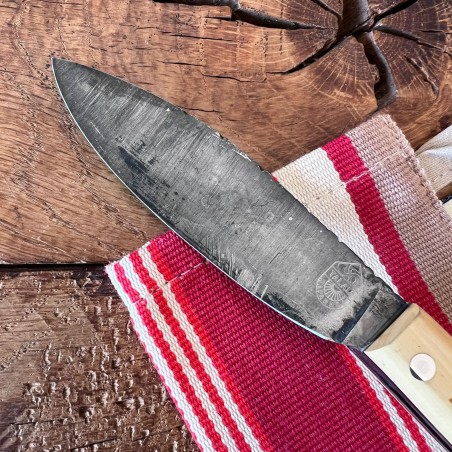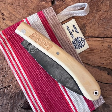 Cette version en bois de buis naturel et lame en acier carbone incarne la forme la plus authentique du couteau du berger basque.