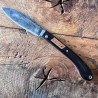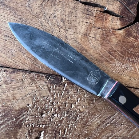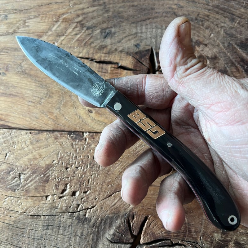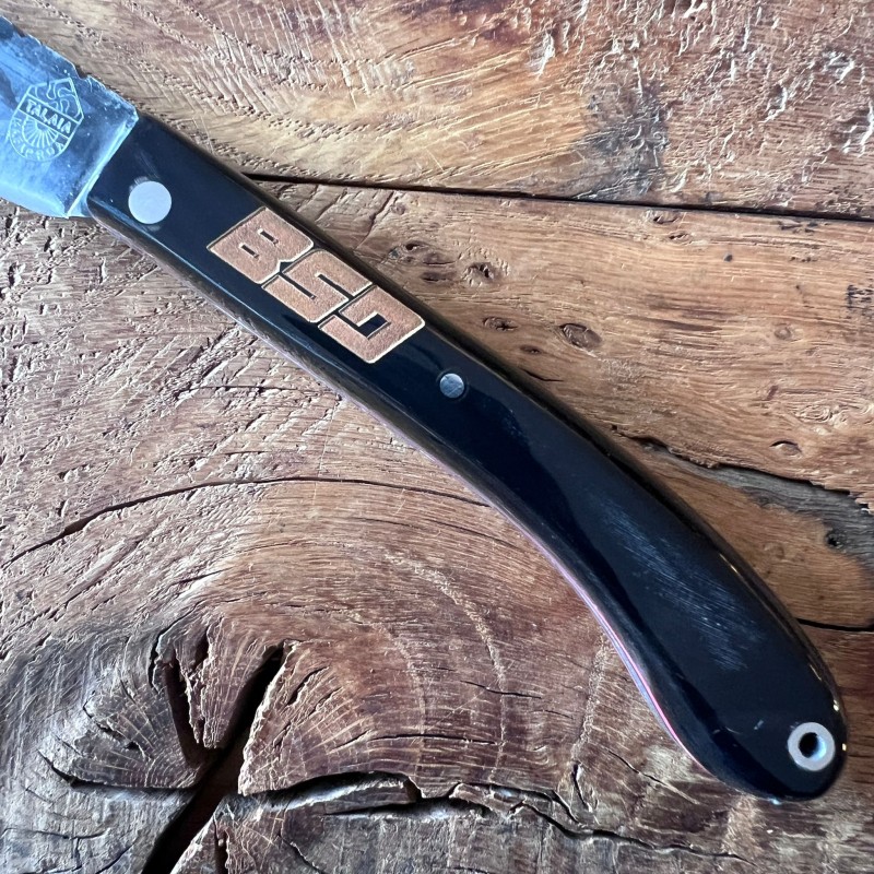 La lame en acier carbone, vive et fine, donne un tranchant exceptionnel, tandis que la corne noire offre une prise en main noble et durable.