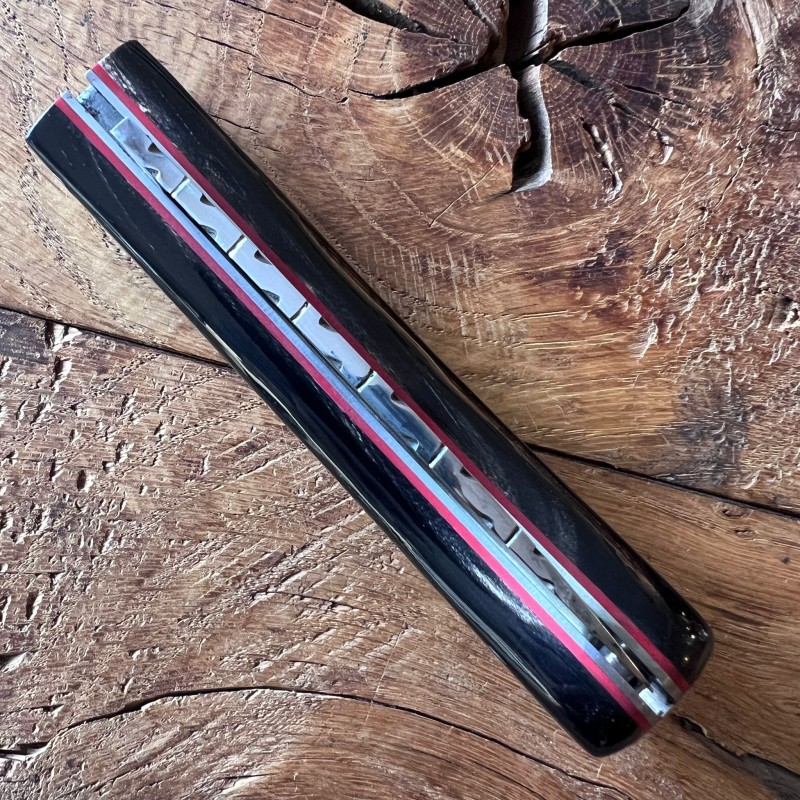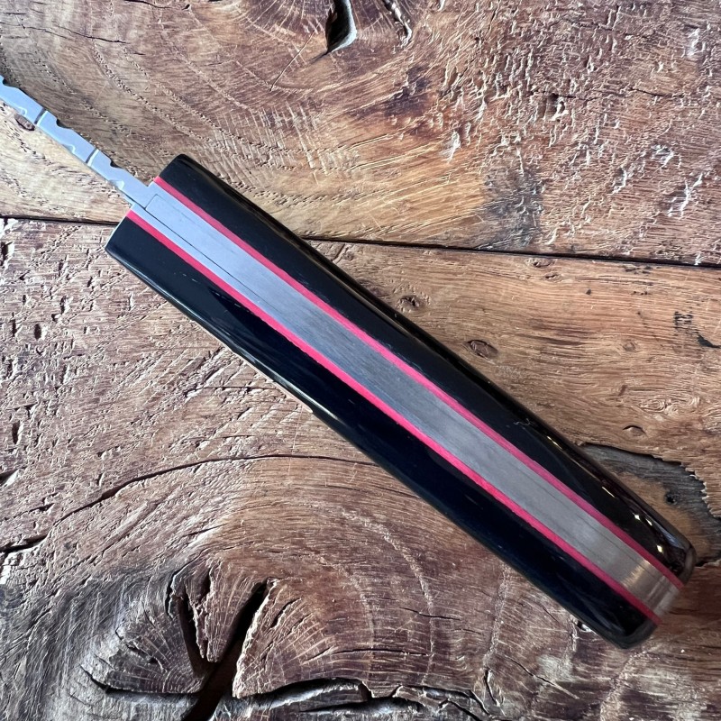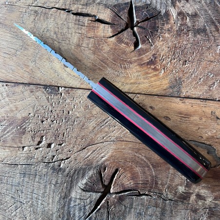 Manche en corne de buffle noire, intercalaires rouges, lame carbone.