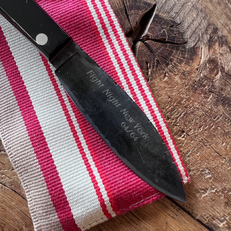 • Lame (9 cm) : Acier carbone, forme feuille de sauge, affûtage fin et patine naturelle. Gravure Fight Night New York + numéro.